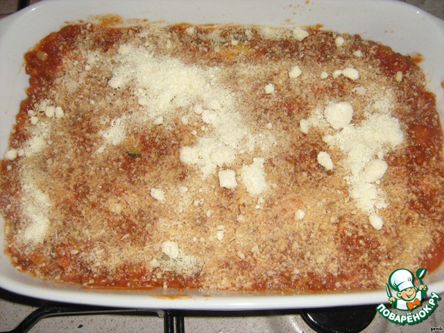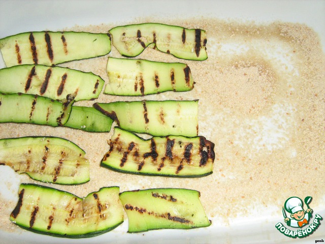 На пиастре(или тонкостенной сковороде) обжариваем без масла тонкие ломтики цуккини(можно заменить на другой овощ). Смазываем маслом посуду в которой будем выпекать и посыпаем панировочными сухарями(чтобы не прилипло). Начинаем выкладывать слой цуккини.