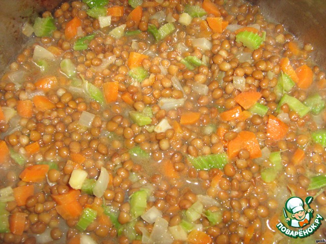 В кастрюльке на растительном масле обжариваем лук,морковь и сельдерей порезанные мелкими кубиками. Добавляем 1 банку чечевицы вместе с жидкостью и даем ей испарится.