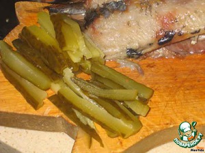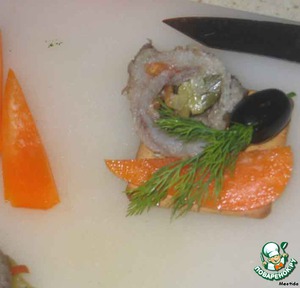 каждую половинку сельди разрезаем еще пополам горизонтально, на краешек выкладываем немного морковочки с лучком(вынутые из мариада) и немного огурчика