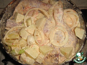 • Окорочка натираем солью. Лук режем крупными кольцами, картофель кубиками. Смешиваем майонез с аджикой (сколько аджики - дело вкуса). Маринуем все вместе минимум 2 часа, а если оставить на ночь, то ещё лучше! Выкладываем все на противень и запекаем при 200 гр около 40 мин (переворачивая время от времени окорочка). Приятного аппетита!