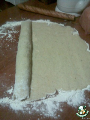 Стол обильно посыпать мукой и раскатать тесто, стараясь придать пласту форму прямоугольника.