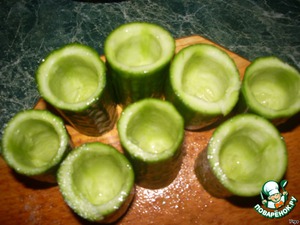 • В зависимости от длины огурчиков каждый разрезаем на 2-3 части, ложкой выскабливаем серединку.