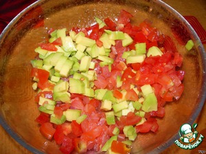 • Небольшими кубиками режем семгу, помидоры (предварительно удалив семена)и авокадо. Смазываем майонезом.