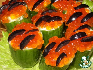 • Начиняем огурчики и выкладываем шапку из икры. Маслинки режем на полосочки и выкладываем сверху икры (имитируем полоски тигра:))