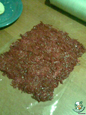 Выложить на пищевую пленку первым слоем. -