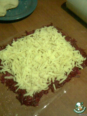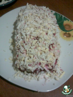 Яйца натереть на терку и посыпать сверху, получившийся рулет.