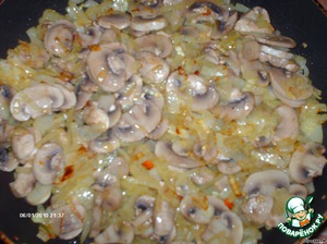 Почистить, нарезать и обжарить лук. Я его немного солю. Грибы отварить (если грибы не крупные, то можно и целые) и добить их в луку.
