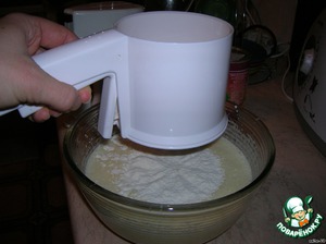 Добавляем просеянную муку и аккуратно перемешиваем.