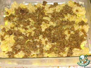 Теперь все соединяем. Форму смазываем маслом, поливаем соусом. Макароны тонким слоем укладываем в форму, сверху обжаренный фарш и соус.