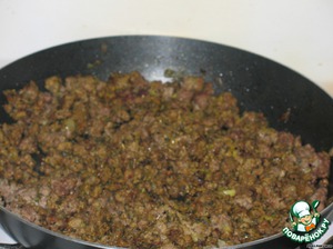 Обжариваем фарш и лук, солим, добавляем пряности.