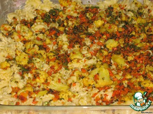 Затем снова макароны, начинка из моркови и капусты, соус. Третий слой повторяет первый - макароны, фарш, соус.