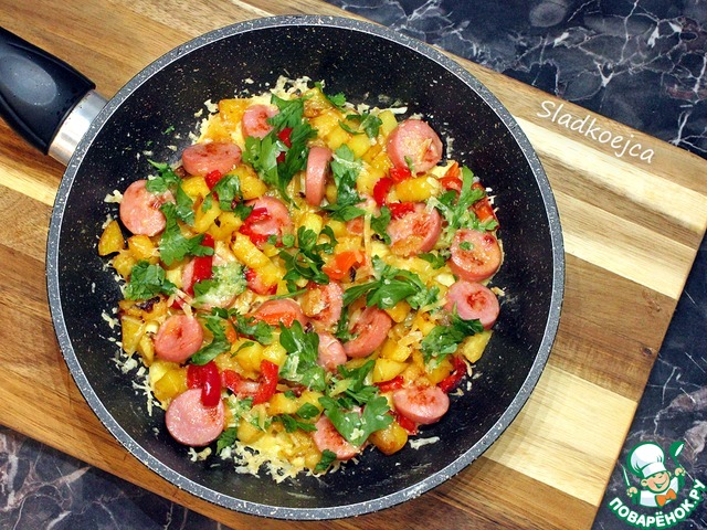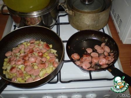 Сосиски и лук мелко нарезать и обжарить. Половину сосисок и лука выложить в картофель. Примять лопаточкой.