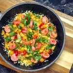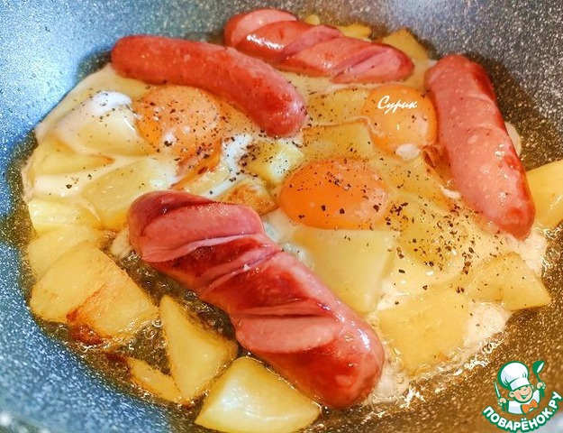 Яйца взбить и смешать с оставшимися сосисками и луком. Выложить на картофель.