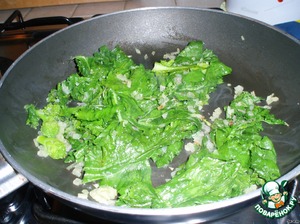 Тем временем лук поджарить на растительном масле вместе с анчоусами (или килькой до их полного "растворения") и положить листья, налить несколько ложек воды из кастрюли с пастой, прикрыть крышкой и варить минут 5.
