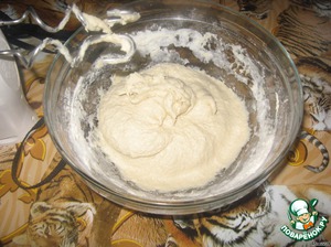 Земесить тесто (я миксером) и оставить его подходить. Даже не скажу сколько оно подходило т.к. меня поймут только бухгалтера, делающие сейчас годовые отчеты, а у меня под боком еще мешающие муж и дочка...в общем я забыла о тесте на пару часов.