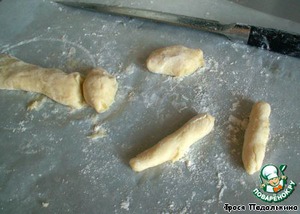 Скатать длинную колбасу, от нее отрезать кусочки толщиной 1,5-2 см, раскатать в ладонях "пальчики". Духовку разогреваем до 200 гр., форму для запекания смазываем растительным маслом и греем в духовке несколько минут.