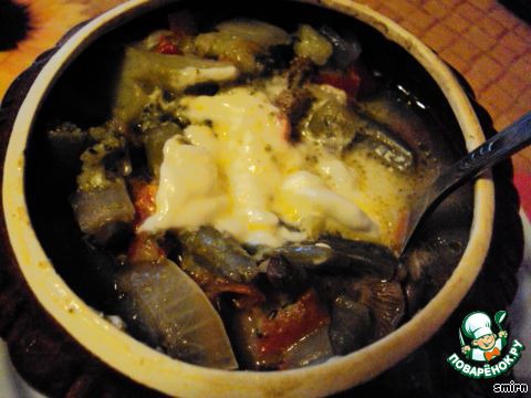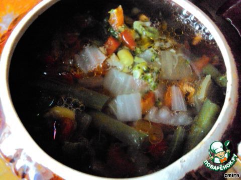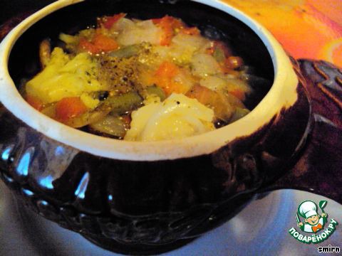 Вот и овощи поспели. Отвар процедить. Овощи разложить по горшочкам.