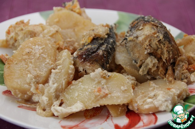 Очищаем и нарезаем ломтиками скумбрию, смешиваем с специями, луком (1 шт), натёртой морковкой (0,5 шт) и майонезом. Пусть так постоит 0,5 часа. Очищаем картофель и нарезаем его кольцами, добавляем лук, тёртую морковь, соль, перец и запраляем майонезом. Форму застилаем фольгой, выкладываем картофель (я добавляю во внутрь ещё немного масла (50 гр), поверх картофеля - скумбрию. Заворачиваем хорошо в фольгу и ставим в разогретую духовку (180-200°).