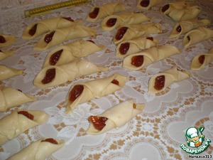 Рaскатываем пласт из теста (2 мм), разрезаем на квадратики, кладём в центр повидло и заворачиваем в виде рогаликов или конвертиков.