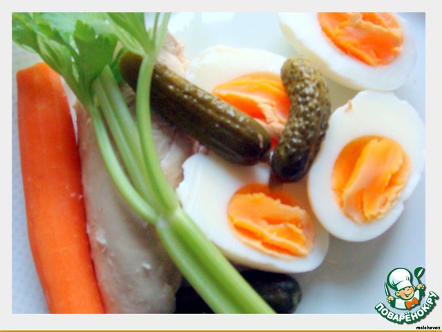 Куриную грудку, сельдерей и яйца мелко порезать. Морковь натереть на терке. Добавить мелко порезанную зелень петрушки. Заправить смесью йогурта, майонеза, сока лимона и горчицы, которые мы предварительно смешиваем. Посолить и поперчить. Хорошо размешать.