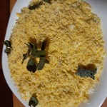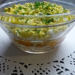 На фото вижу желток, проглядывающий сквозь майонез (т.е. сначала положили майонез,потом посыпали желтком). Всё совпадает с текстом.