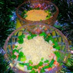 Украсить на свое усмотрение. Я украшала хризантемой из лука: возьмем почищенную луковицу, срежем верх и низ (приблизительно 0,5 см). Разрежем луковицу на части, не дорезая около 0,5 см до основания.