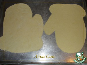 Из бумаги вырезать заготовку в форме рукавички, тесто раскатать и вырезать 4 пласта в виде рукавичек. Проткнуть несколько раз, чтоб не вздувались. Выпекать до готовности.