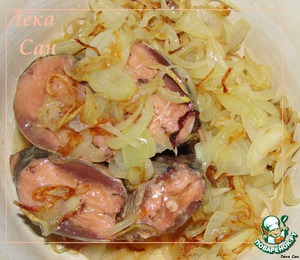 Лук нарезать и припустить на сковороде до мягкости. Размять рыбные консервы вилкой, добавить лук и 2 ст.л майонеза. Перемешать.