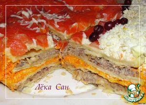 Тортик для конкурса "В новогоднем стиле". Хотела оформить в виде валенка, но оказывается такой тортик уже был представлен. )) Всем любителям рыбных блюд тортик должен понравиться.