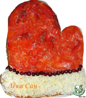 Выложить сверху форель, меховушку сделать из натертого яйца, украсить клюквой. Майонезом нарисовать снежинку и стежки на рукавичке.