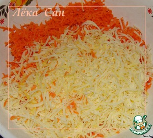 Морковь и сыр натереть на мелкой терке, перемешать, добавив 2 ст.л майонеза.
