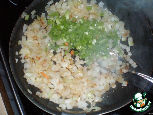 Лук, морковь и сладкий перец обжарить на растительном масле.