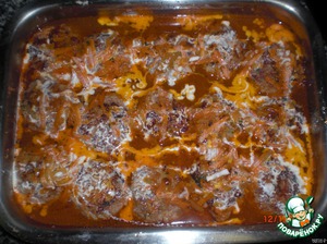 Заливаем приготовленным соусом, добавить немного сливок или сметаны и поставить в горячую духовку на часок.