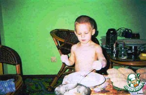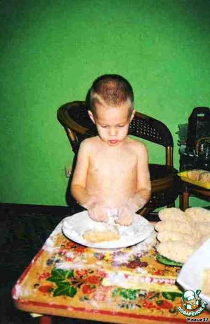 Берем маленький кусочек грудки, заворачиваем в него порцию начинки. Этот рулетик заворачиваем в большой кусок так, чтобы масло не было видно. Полученную котлетку обваливаем в муке. (У нас этим с удовольствием занимался малыш).