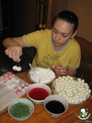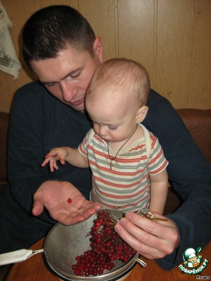 Итак... Начнём с подготовительных работ – готовим краски. Поскольку мы сторонники натуральных красителей, то использовали соки калины и свеклы (если у вас есть вишня, кизил и пр., что может послужить краской для вишен-черешен – дерзайте! Также хорош морковный сок, но мы его не сделали в целях экономии времени). Для начала надо оборвать калину с веточек. Эту ювелирную работу делают папа (мой муж Игорь) и наш младший сынок Вовик (1 годик 3 недели).
