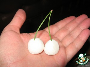 Выкладываем белые вишенки на тарелку и даём немного подсохнуть. Поверяем готовность: берём за хвостики и чуть-чуть встряхиваем – если шарики не спадают, значит можно красить.