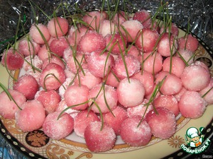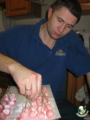 Поскольку точного описания процесса не было, то мы пробовали красить и по-другому: можно шарики по одному макать в сок и обваливать в сахаре, а потом уже парочками протыкать иголками. Тут мне помогал муж, потому что вишенки быстро сохли и надо было работать быстро. Первый способ удобнее.