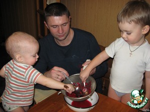 Далее готовим свекольный сок – просто давим его через соковыжималку. И опять Вовик приходит на помощь папе! Так рвался помогать, что таки залез на руки, и папе пришлось справляться одной рукой.