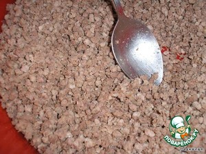 Нам понадобится кусок свиного мяса, отвариваем его и мелем в мясорубке. Солим и заправляем специями.