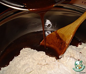В глубокую миску высыпать муку и разрыхлитель. Вливая постепенно тонкой струйкой медово-масляную массу - замесить тесто.