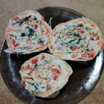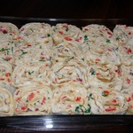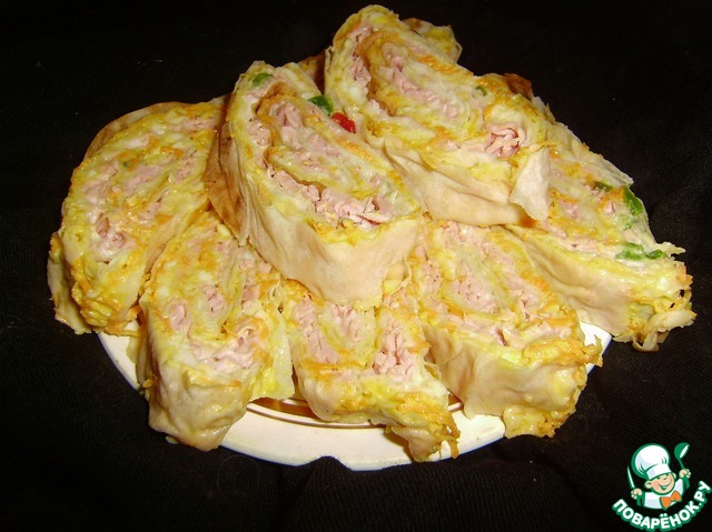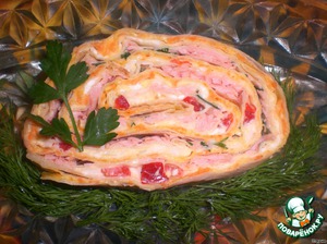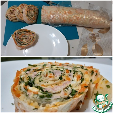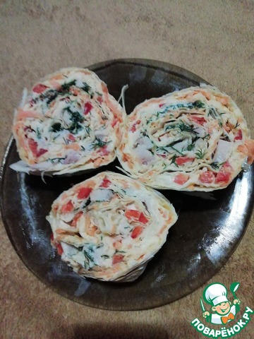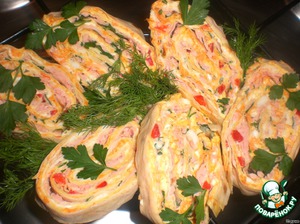 Это рулет из лаваша) Знаю-знаю, много их на сайте. Но, прошу, примите и мой вариант. Впервые я его приготовила для Новогоднего застолья. Все мои коллеги были в восторге и наперебой просили рецепт. Рулет получается очень нарядным, разноцветным. Настоящее украшение праздничного стола! Готовится очень быстро, поэтому незаменим, когда на пороге неожиданные гости.