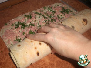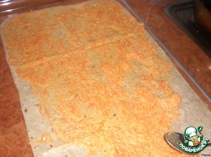 Лист лаваша смазываем майонезом. На нем распределяем морковно-сырную начинку. Кстати, её можно кушать как салат, очень вкусно! -