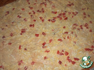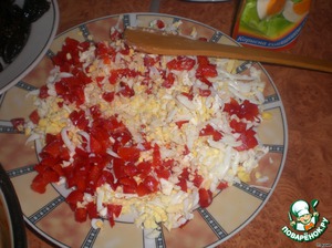 Вторая начинка: яйца на мелкой тёрке + болгарский перец, нарезанный маленькими кубиками (у меня был замороженный) -