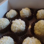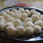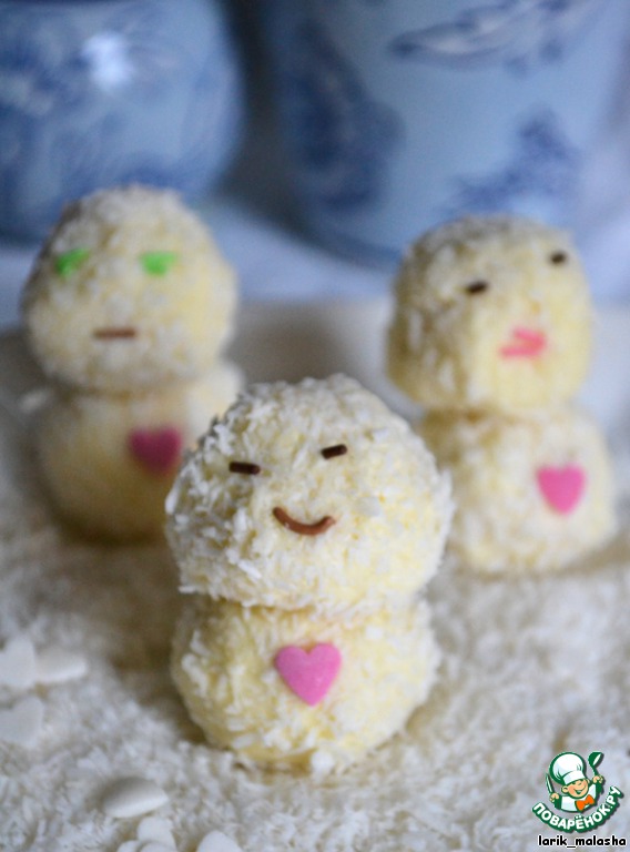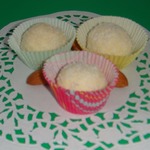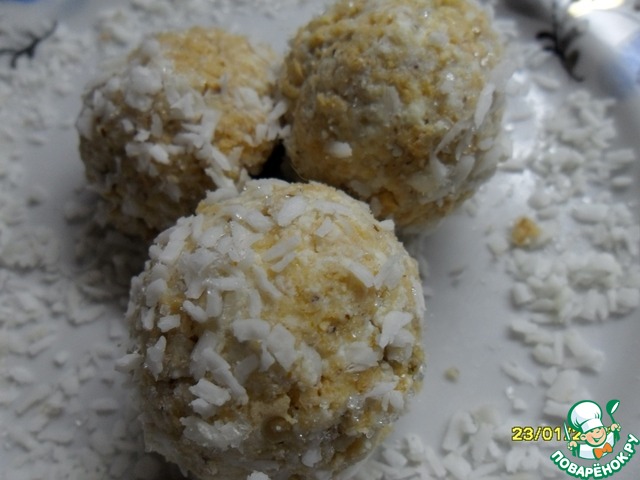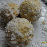 Итак, вооружаемся двумя чайными ложками, одной набираем наш крем, второй ложкой скидываем в кокосовую стружку. Кладем орешек, чуть притапливаем и, подгребая с боков кокос, формируем конфетку. Жалко, нет третьей руки, но двух на процесс лепки и фотографирования мне не хватило. Извините.