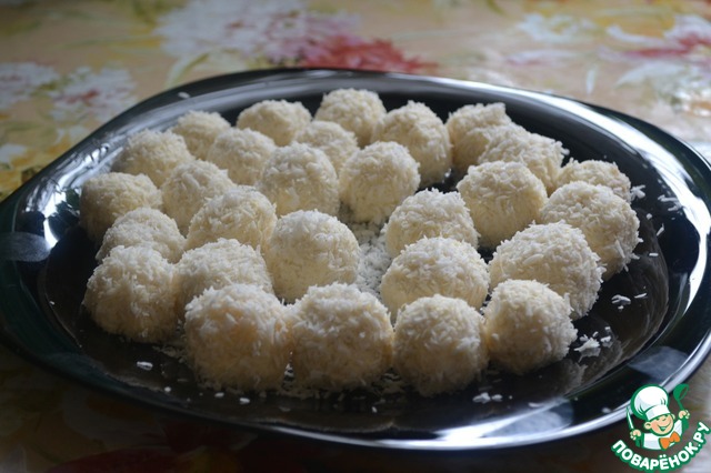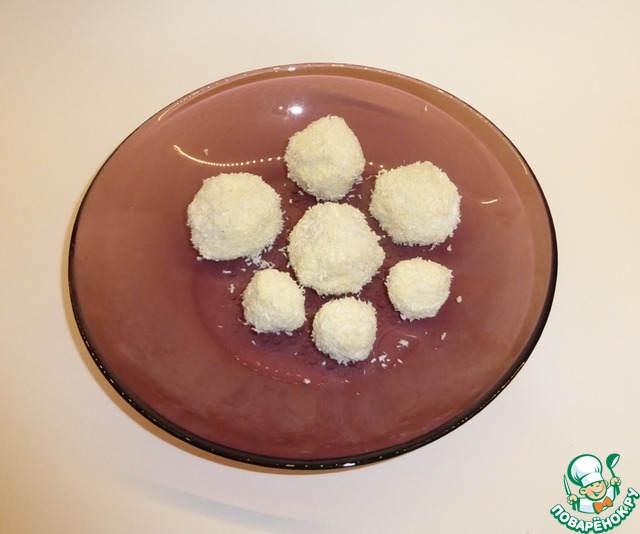 На разделочную доску или просто на тарелку насыпаем грамм 50 кокосовой стружки. Тут мы будем формировать конфетки.