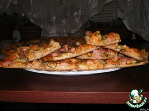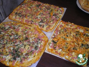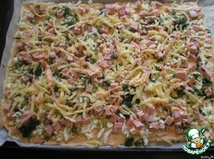 Выложите тесто на противень, застеленный пергаментом. Смажьте тесто смесью майонез+кетчуп и выложите начинку