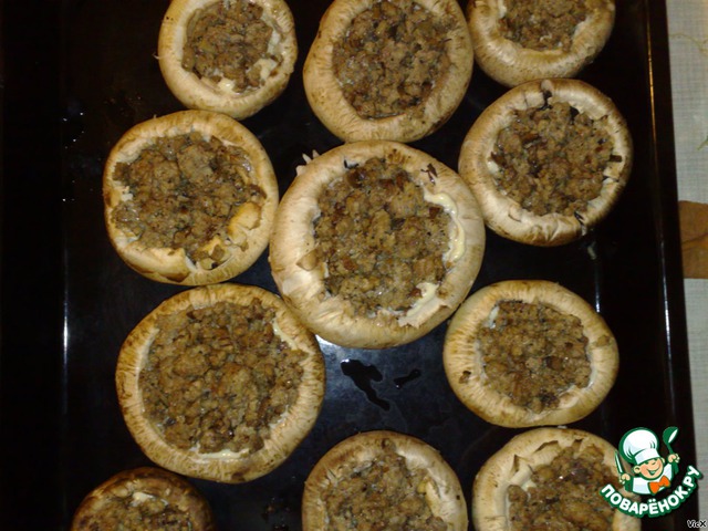 На дно каждой шляпки гриба кладем майонез (желательно его растереть по всему основанию шляпки), сверху засыпаем прожаренный фарш.