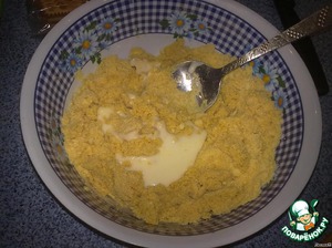 Печенье тоже перемолола в порошок. Все перемешала. Добавляем сгущенку постепенно. Пока масса не станет липкая и клейкая.