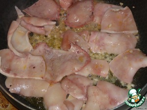 • На сковороде разогрейте масло, положите чеснок, затем кальмары. Обжарить с двух сторон, примерно 3 мин. Всего 3 минуты!