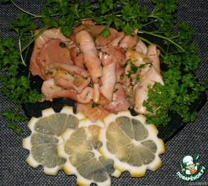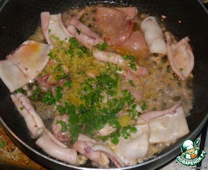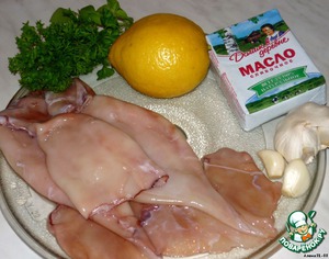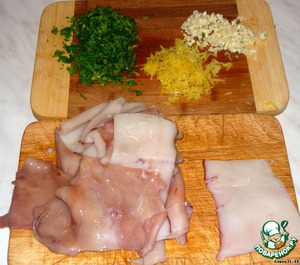 • Кальмаров очистить, разрезать на 4 части, не считая хвоста (или плавник там у них?), цедру лимона мелко натереть, чеснок и петрушку меленько нарезать. Из лимона выжать сок.